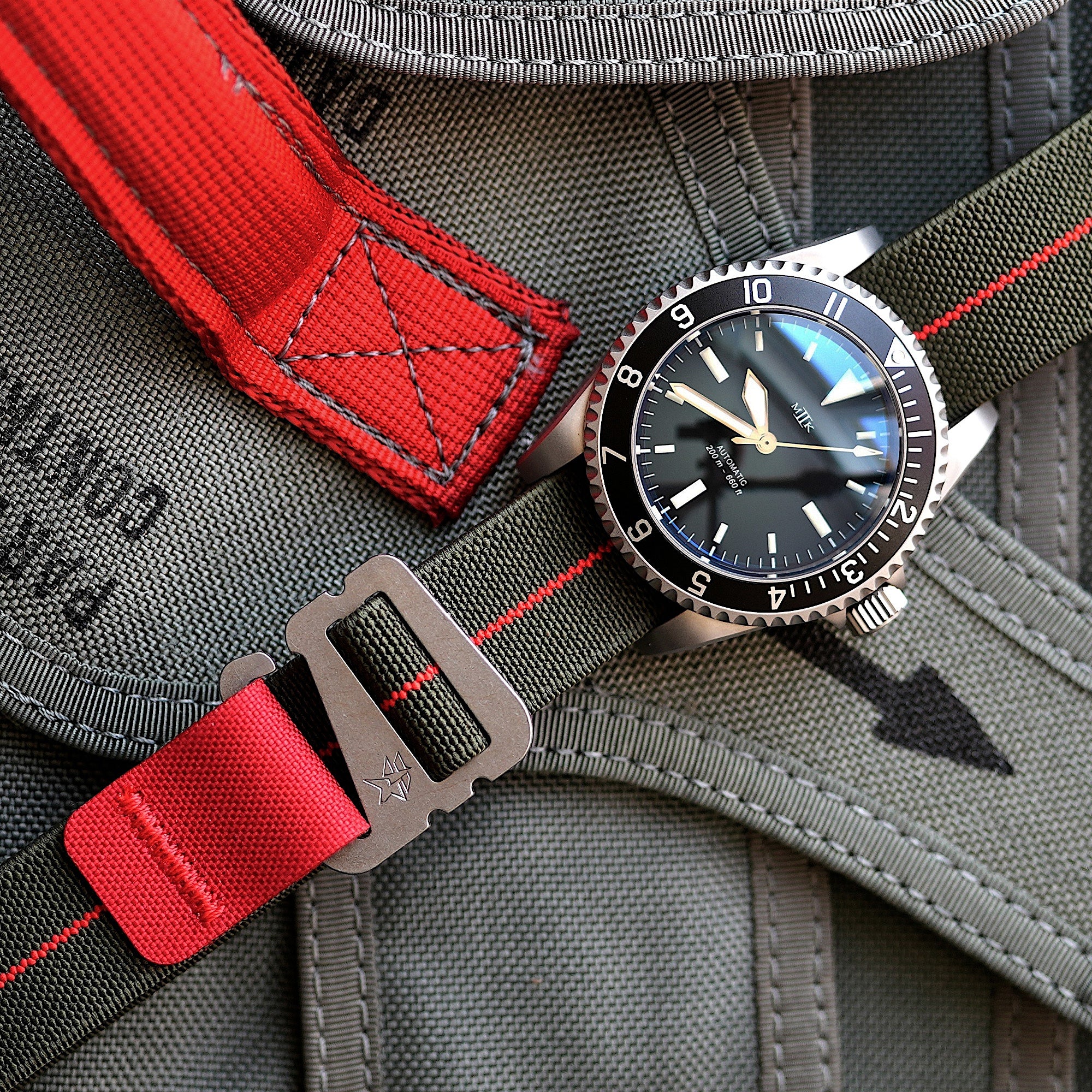 The Riggerband is an elastic webbing strap that boasts a proprietary registered watch clasp design which echos influence drawn from vintage Marine Nationale Dive belt buckles.