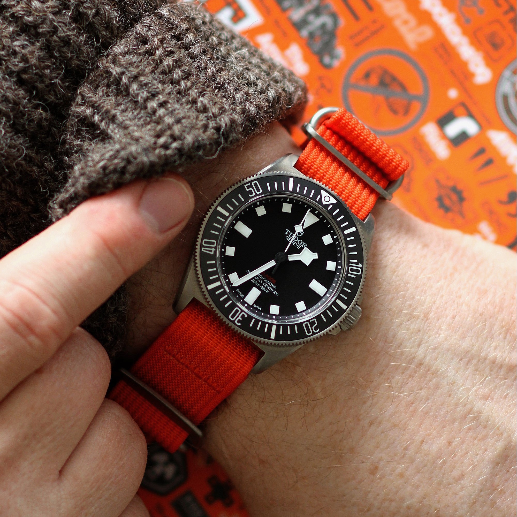 Worn with the Marathon GSAR, I’ve gone through multiple styles of straps like nato, MN and rubber 2-piece and steel. Some have snapped or stretched. None have compared to the O-rig. This thing is rock solid and looks awesome, the near infinite adjustability make it comfortable no matter what, hot or cold weather or over a wetsuit.